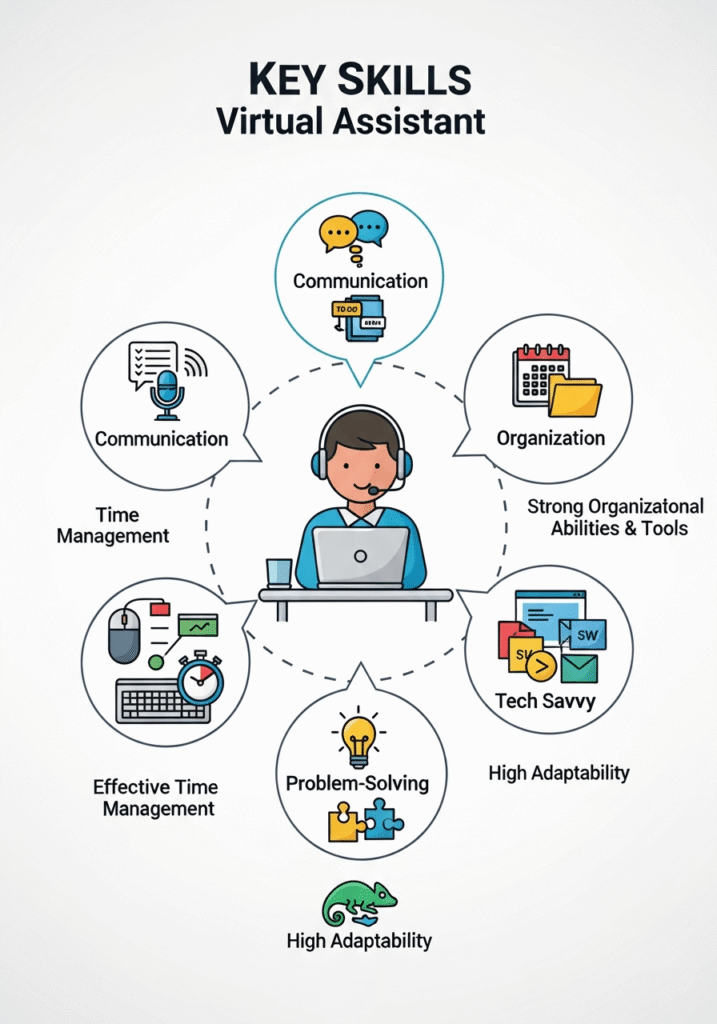 Virtual assistants need skills in communication, time management, and organization. Proficiency in software like Microsoft Office is essential. Knowledge of social media, email management, and customer service can also be beneficial.